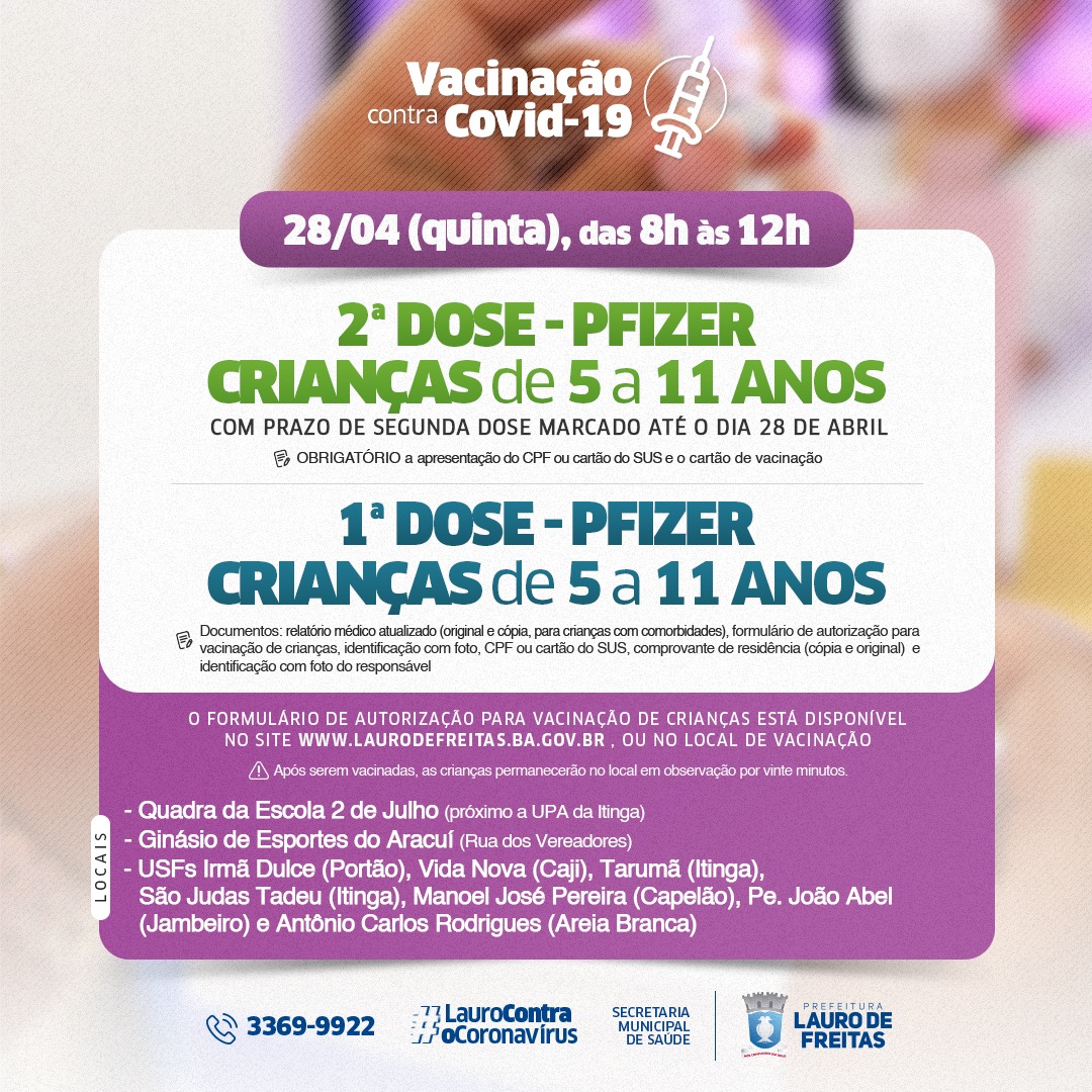 Nesta quinta-feira (28), das 8h às 12h, as equipes da Secretaria Municipal de Saúde (SESA) de Lauro de Freitas, seguem com a vacinação de crianças com idade entre 5 a 11 anos, contra a COVID-19. Será aplicada a 1ª dose da vacina da Pfizer e a 2ª dose do mesmo imunizante, em crianças com prazo marcado para a dose de reforço até o dia 28 de abril. As crianças deverão estar acompanhadas pelos pais ou responsáveis legais.