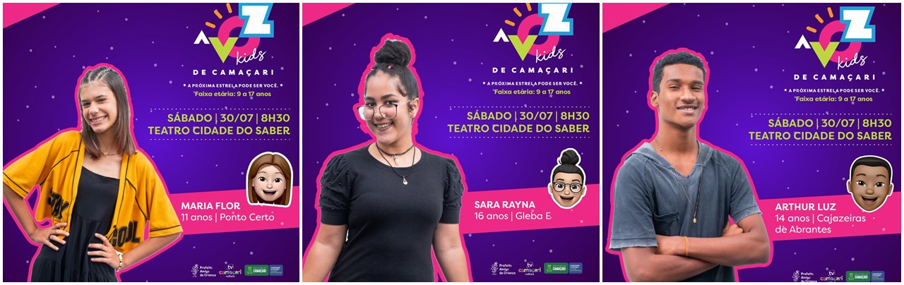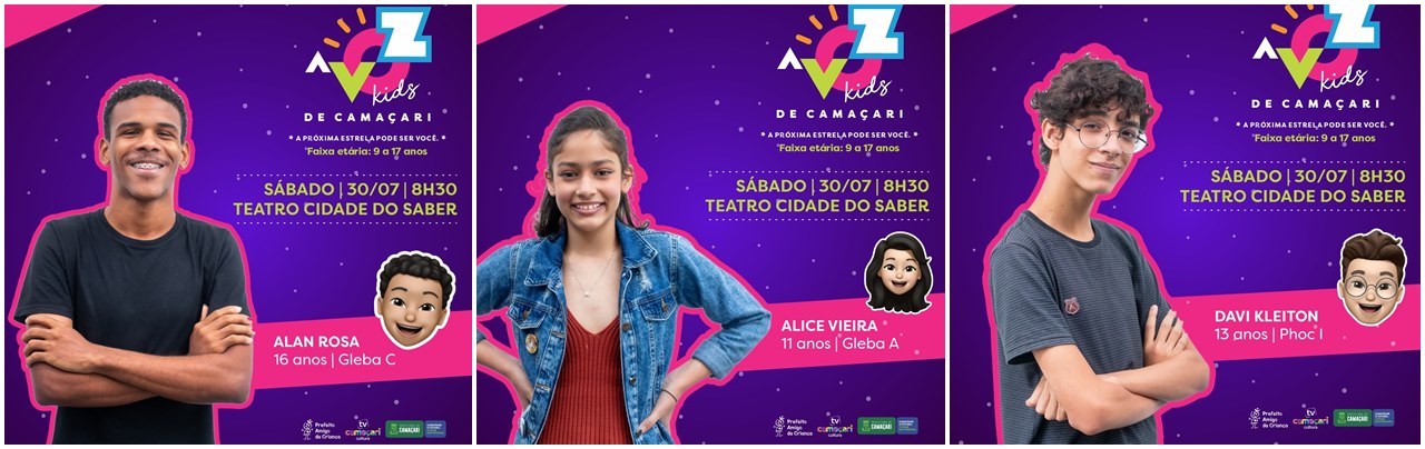 Neste sábado (30/7), às 10h, no Teatro Cidade do Saber, será gravado o programa de estreia do concurso cultural A Voz de Camaçari Kids, oportunidade em que, pela primeira vez, o público poderá conferir os talentos dos cantores mirins que participam da iniciativa. A entrada acontece entre às 8h30 e 9h30, e a troca de 1 quilo (kg) de alimento pelo ingresso, que garante o acesso, pode ser feita até a sexta-feira (29/7), das 9h às 14h.