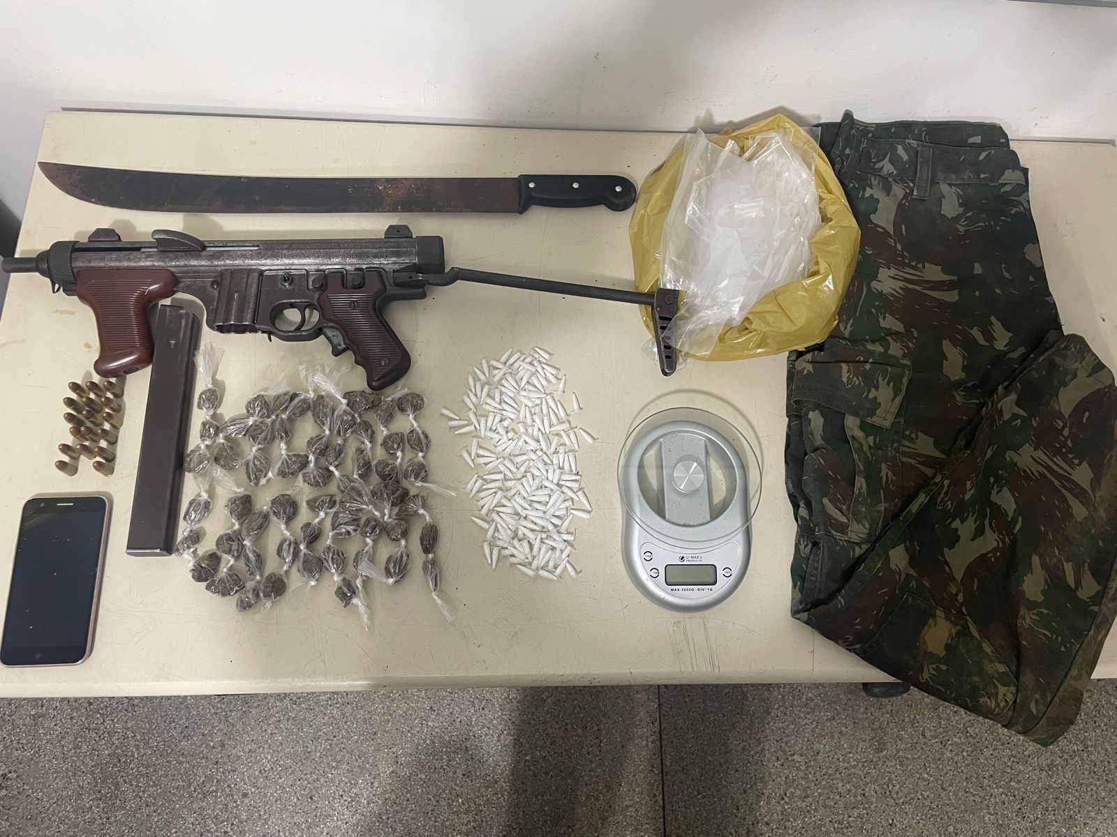 Uma metralhadora calibre 9mm, carregador, munições, 233 porções de drogas (maconha e cocaína), uma balança e outros materiais utilizados no tráfico de entorpecentes foram apreendidos em Camaçari, Região Metropolitana de Salvador (RMS). A ação ostensiva foi realizada na segunda-feira (5), pela Companhia Independente de Policiamento Especializado (Cipe) Polo Industrial.