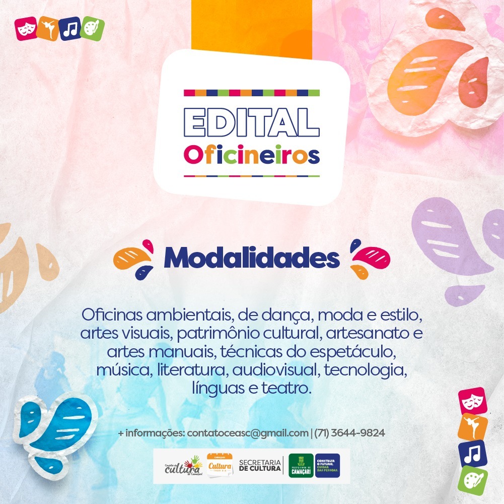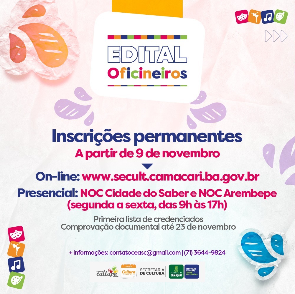 Com o objetivo de fomentar e descentralizar o acesso à cultura e à produção de bens culturais, a Secretaria da Cultura (Secult) abriu nesta quarta-feira (9/11), inscrições para o edital Oficineiros, com investimento total estimado de R$ 300 mil em recursos próprios. O credenciamento visa a formação de um banco de profissionais com experiência técnica na área cultural, a fim de ofertar serviços de capacitação em atividades culturais como instrutores, ministrando oficinas em diversas modalidades culturais, em diferentes localidades e bairros de Camaçari.