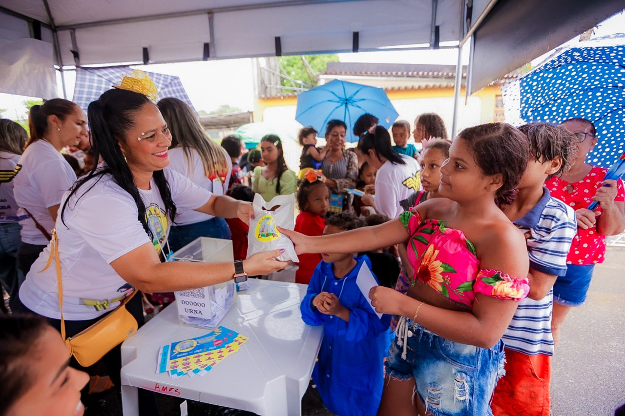 Nem mesmo a forte chuva que caiu no início da tarde deste domingo (27) tirou o brilho da maior festa infantil realizada em Camaçari. O público apareceu aos poucos, logo após a chuva, e foi preenchendo os espaços reservados para as crianças que chegavam animadas e cheias de energia para aproveitar os brinquedos montados na arena da festa, as apresentações do palco e, claro, os vários brindes e bicicletas que aguardavam o momento do sorteio.