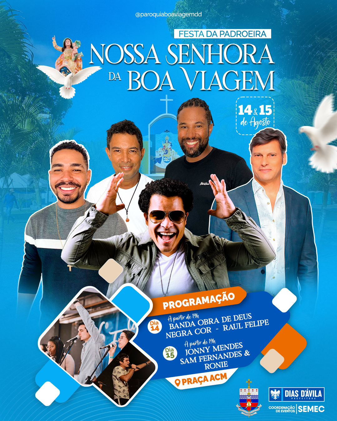 Em comemorações à Padroeira do município de Dias d'Ávila, a Prefeitura promoverá, juntamente com a Paróquia Nossa Senhora da Boa Viagem, localizada no centro da cidade, neste domingo (14) e segunda-feira (15), mais uma edição da Festa da Padroeira. Os festejos acontecerão na Praça ACM, com shows de artistas católicos e da música nacional, a exemplo da Banda Obra de Deus, Negra Cor, Raul Felipe, dentre outros.