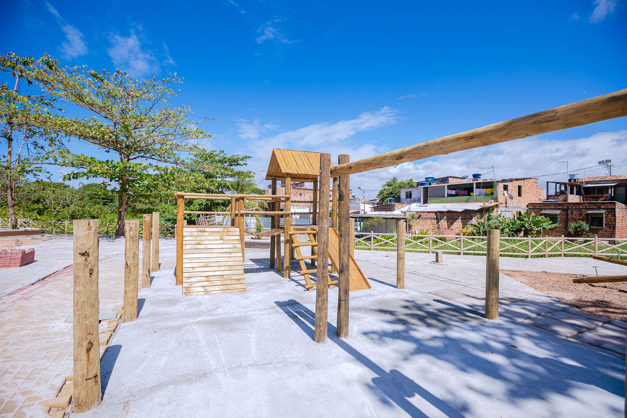 Conforme a equipe de engenharia da Seinfra, no equipamento, que está localizado na Rua Pirajá, foram concluídos os serviços de limpeza da área de implantação da praça, terraplanagem, execução dos brinquedos do parque infantil, quiosques abertos e pergolados em eucalipto. Seguem em andamento as etapas de pavimentação com piso intertravado, instalações elétricas para iluminação, construção dos quiosques e boxes comerciais, guarda-corpo em eucalipto e ponte de concreto armado, além da execução de bancos canteiros, estacionamento e rampa de acesso à praça.
