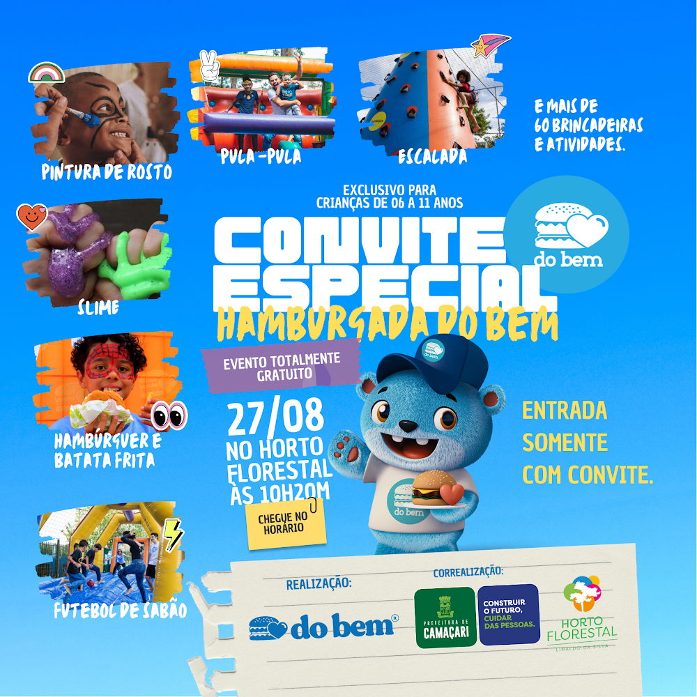 Com o intuito de promover a integração social entre voluntários e crianças através de uma experiência inédita, Camaçari recebe neste sábado (27/8), das 10h às 16h, o projeto Hamburgada do Bem. O evento, que acontece no Horto Florestal Linaldo da Silva, é voltado às crianças de 6 a 11 anos, que estejam prioritariamente matriculados na rede pública municipal de ensino.