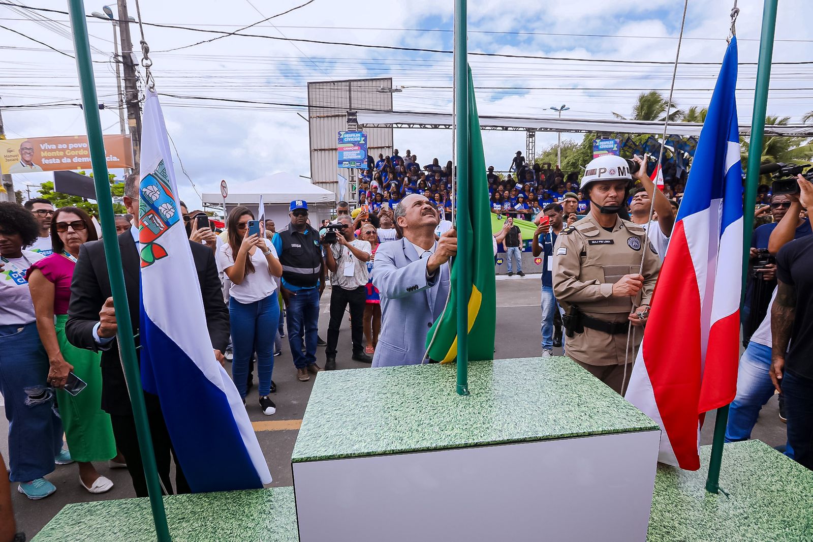 Abrindo as festividades em comemoração aos 264 anos de emancipação política de Camaçari, completados no próximo 28 de setembro, aconteceu neste sábado (10/9) o desfile cívico de Monte Gordo, que contou com a presença do prefeito Elinaldo Araújo, vereadores, secretários municipais e demais autoridades. A abertura oficial do evento foi marcada pelo hasteamento das bandeiras e a execução dos hinos Nacional e Municipal, entoados pela Filarmônica 28 de Setembro.